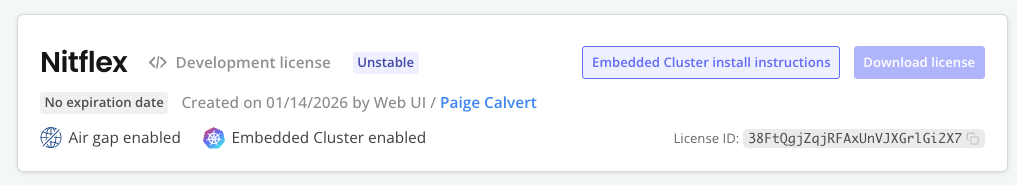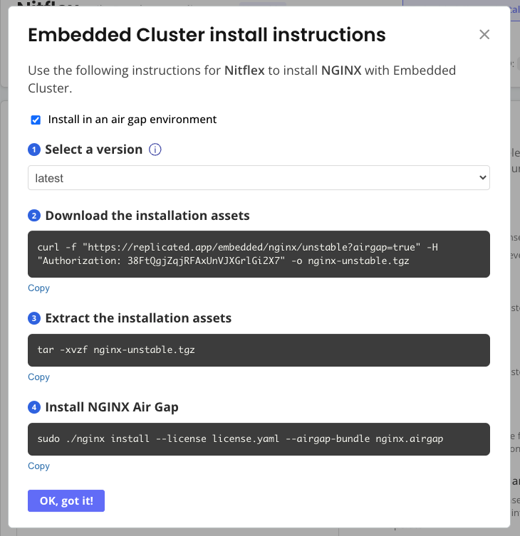 1. In the Vendor Portal, go back to the customer's page (Applications > NGINX > Customers > Nitflex) and reopen the Embedded cluster install instructions dialog.