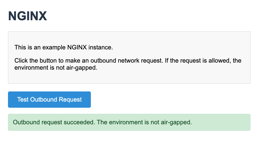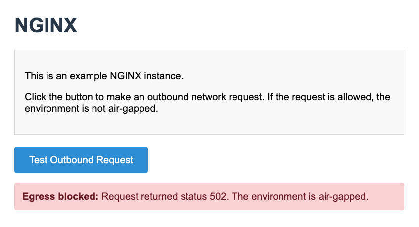 4. On the NGINX app webpage, click Test Outbound Request to make an outbound network request to http://httpbin.org. As shown below, the webpage displays an Egress blocked message because the airgap network policy for the VM does not allow outbound requests.