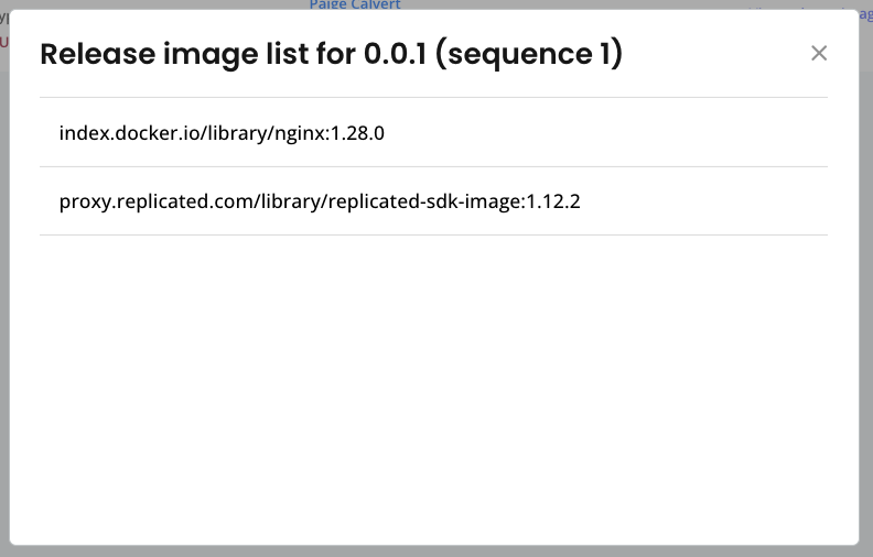7. (Optional) Click View release image list to see the images that Replicated will include in the air gap bundle. This release includes an NGINX image and the Replicated SDK image, as shown below: